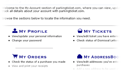 All of your personal information can be viewed, edited and tracked in the My Account section of parkingticket.com. It is your Control Center, where only you can manage all aspects of your account using a simple interface.